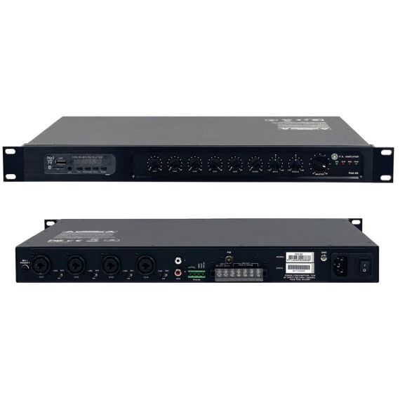 Amplificatore 60W con mixer incorporato a 5 ingressi (4 XLR combo Mic/Line + 1 doppio RCA AUX) e riproduttore multimediale con MP3, Bluetooth e Radio FM.