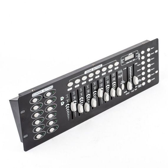 Funzioni principali: 192 canali con possibilità di controllare 12 unità con un massimo di 16 canali cad, 6 chase programmabili da 240 scene, memoria di 30 banchi da 8 scene, 8 slider per controllo manuale, modalità automatica con possibilità di controllo velocità e dissolvenza tra una scena e l’altra, pulsante Master blackout, possibilità di invertire i canali di alcune apparecchiature (es. pan e tilt delle teste mobili) per farle comportare all’opposto di altre durante l’esecuzione dei chase, microfono interno, selettore polarità DMX, display a 4 cifre.