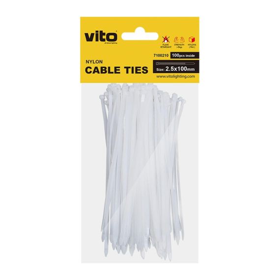 Le fascette per cavi VITO PLASTICK realizzate in NYLON 6 (PA6) sono di colore BIANCO con protezione UV e test di tensione di 8 kg. Ci sono 100 pezzi nella confezione. La dimensione di una fascetta è 2,5X100 mm.