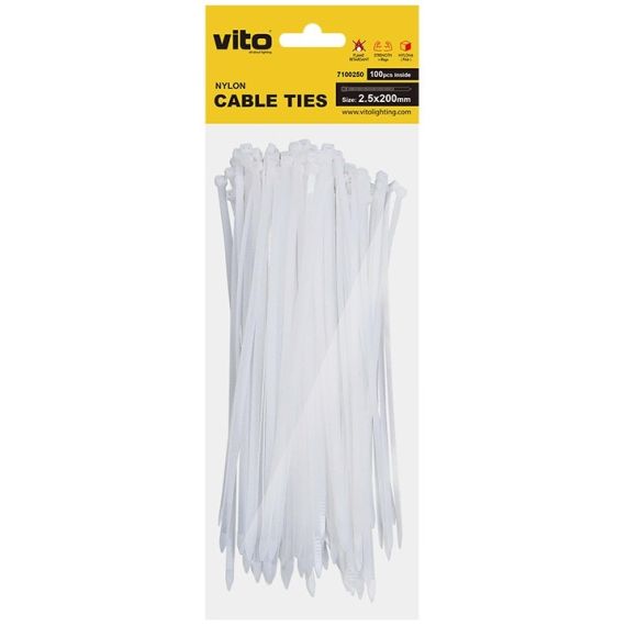 Le FASCETTE VITO IN PLASTICK realizzate in NYLON 6 (PA6) sono di colore BIANCO e hanno un test di tensione di 8 kg. Nella confezione sono presenti 100 pezzi. La dimensione di una fascvetta è 2,5X200 mm.