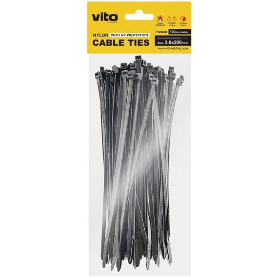 FASCETTE PER CAVI VITO PLASTICK realizzate in NYLON6 (PA6) di colore NERO con protezione UV e test di tensione di 18 kg. Le dimensioni di una fascetta sono 3.6X200 mm. Facile installazione manuale.