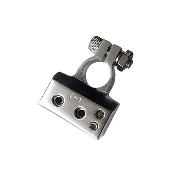 Morsetto batteria polo positvo (+).Dispone di 4 uscite con serraggio a vite per cavi con i seguenti diametri: